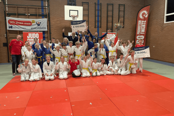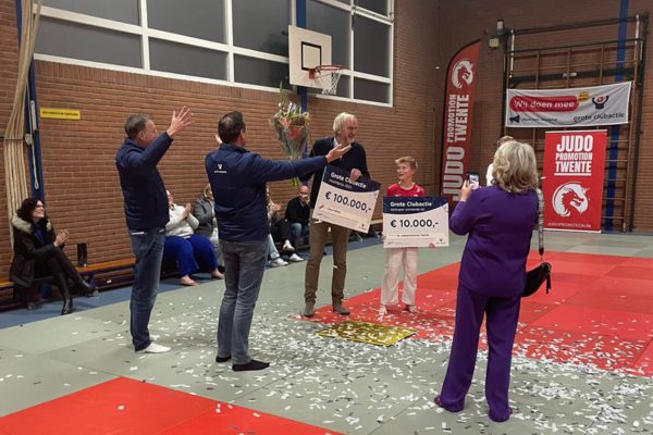 Judoschool Promotion Twente had het doel om €5.000,- op te halen met de Grote Clubactie. Uiteindelijk wisten ze meer dan €9.000,- voor de clubkas op te halen! Ze spaarden onder meer voor een gave clubdag op de vereniging. De €10.000,- extra voor de clubkas was een enorme verrassing! Lotenverkoper Lennart nam de cheque symbolisch in ontvangst.