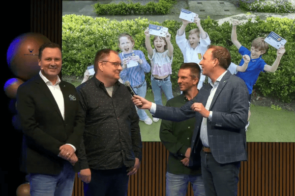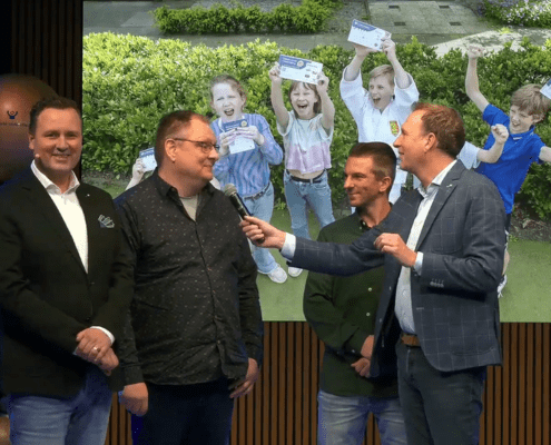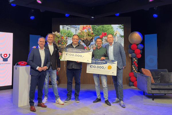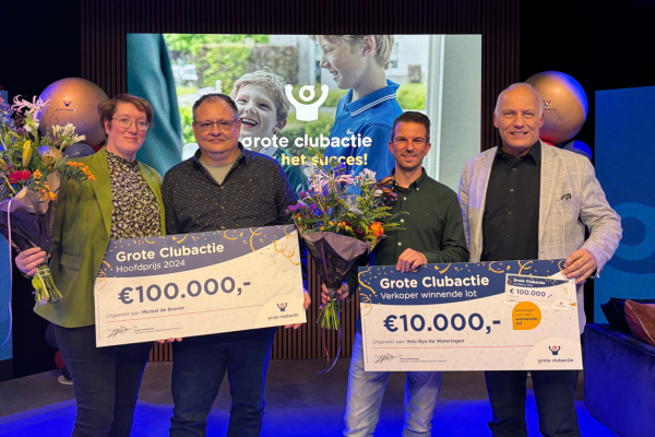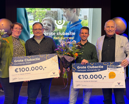 Michiel kocht 3 loten van zijn zoon voor sportvereniging Velo Ryu Ha in Wateringen. Eén van die loten bleek het winennde lot. Daarmee is Michiel de hoofdprijswinnaar van de Grote Clubactie 2024. De vereniging zelf wint daarmee €10.000 extra voor in de clubkas. Tijdens het ‘vier het succes event’ werden zij samen het podium opgeroepen. Daar spraken ze met ambassadeurs Jochem van Gelder en Stan van den Dobbelsteen.