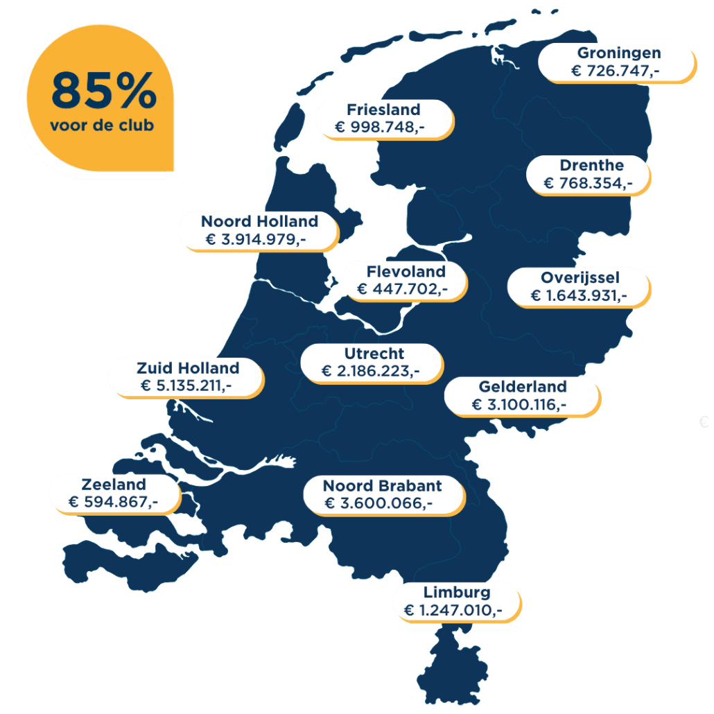2025 was een jaar met mooie hoogtepunten. Er deden nog nooit zoveel verenigingen mee met de actie en samen wisten ze een recordopbrengst van €24.363.954,- op te halen met de Grote Clubactie. Daarbij werd het afdrachtpercentage voor het eerst in de geschiedenis verhoogd van 80% naar 85%. Door deze structurele verhoging wordt er een nóg grotere bijdrage geleverd aan een financieel gezond verenigingsleven.