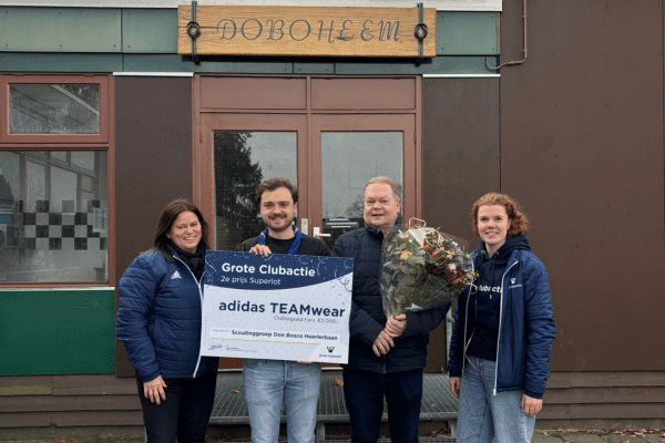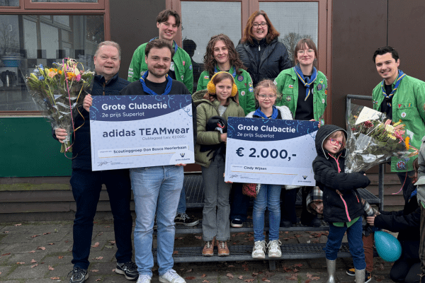 Alleen de leiding van de scoutingvereniging wist dat er een prijs was gevallen. Voor de rest was het een leuke verrassing dat de Grote Clubactie ineens op de stoep stond met twee grote cheques en twee bossen bloemen. Don Bosco gaat goed nadenken over de beste bestemming voor hun gewonnen adidas TEAMwear tegoed. Het zal ongetwijfeld iets leuks worden voor de vereniging!