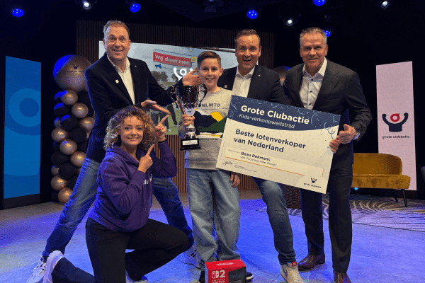 De winnaar van de Kids-verkoopwedstrijd 2025 is bekend. Beau verkocht maar liefst 1491 loten én 1 Superlot voor zijn vereniging. Tijdens het online event werd hij door Grote Clubactie ambassadeurs Jochem van Gelder en Stan van den Dobbelsteen verrast. Hij mocht namelijk op het podium de winnaar bekend maken, hij wist alleen niet dat hij het zelf was! Uit handen van onze reporter Daan en directeur Frank Molkenboer ontving hij zijn prijs: eeuwige roem, een Nintendo Switch2 en een geweldige beker.